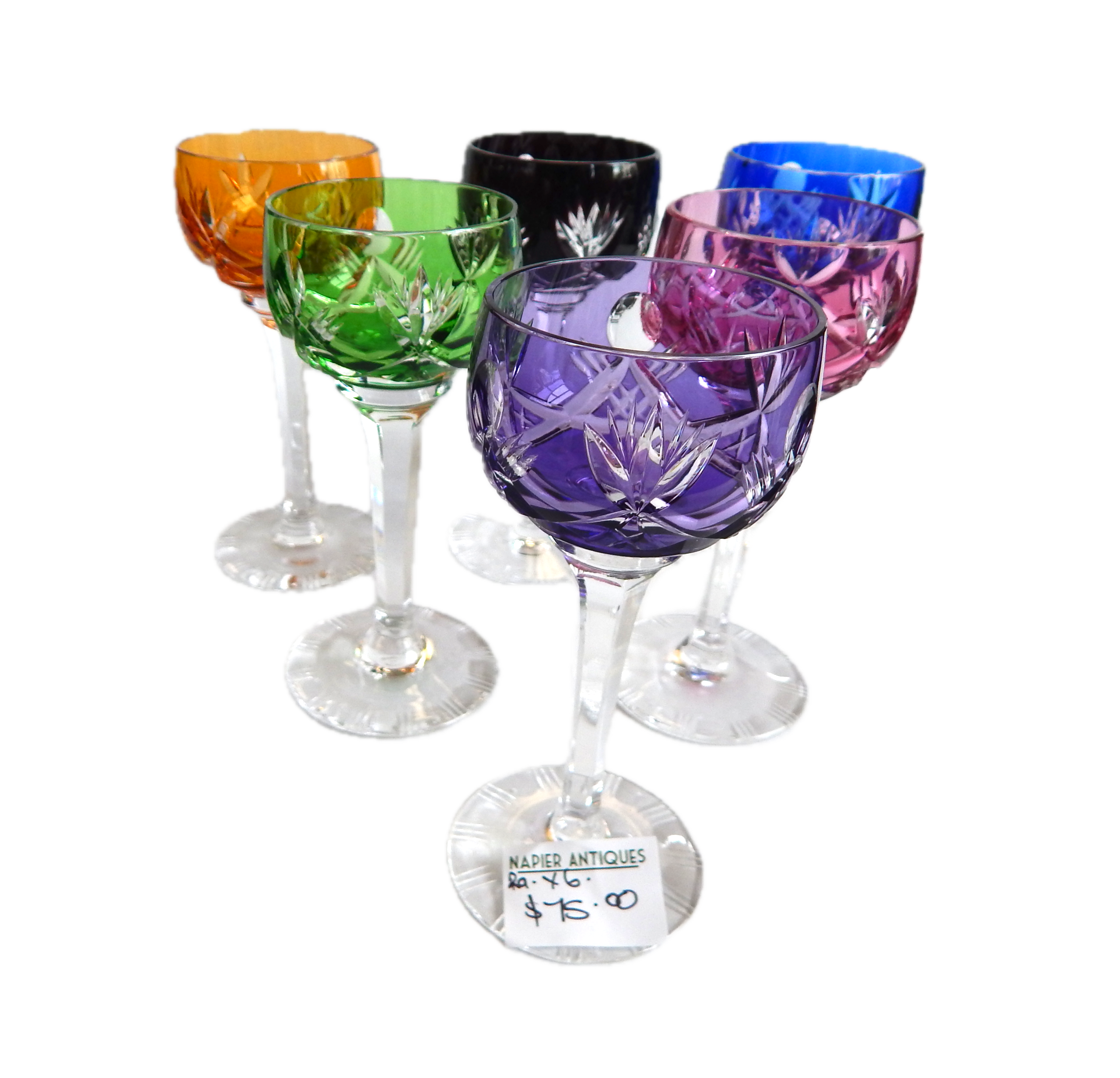 Set of 6 Coloured Cut Crystal Liqueur Glasses