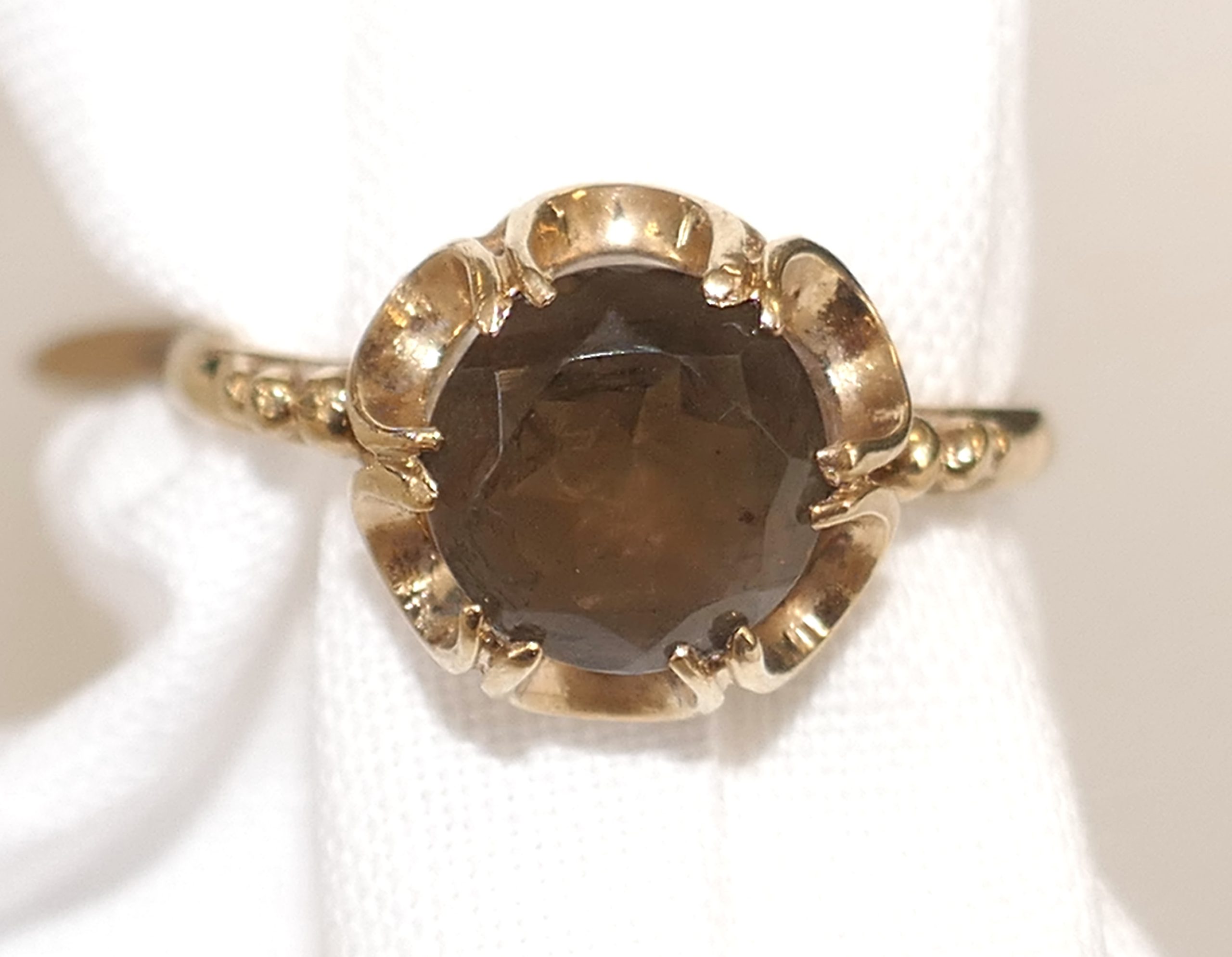 For sale is this sweet 9ct gold ring set with a centre claw set Smokey Quartz.