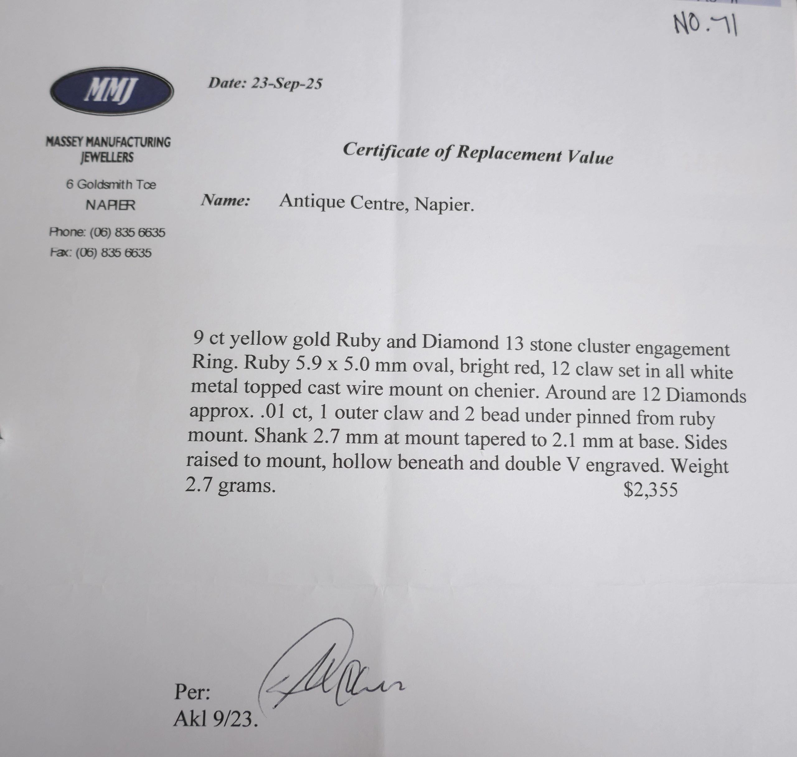 Attached is the new replacement valuation of $2355. Please read this for a full description.