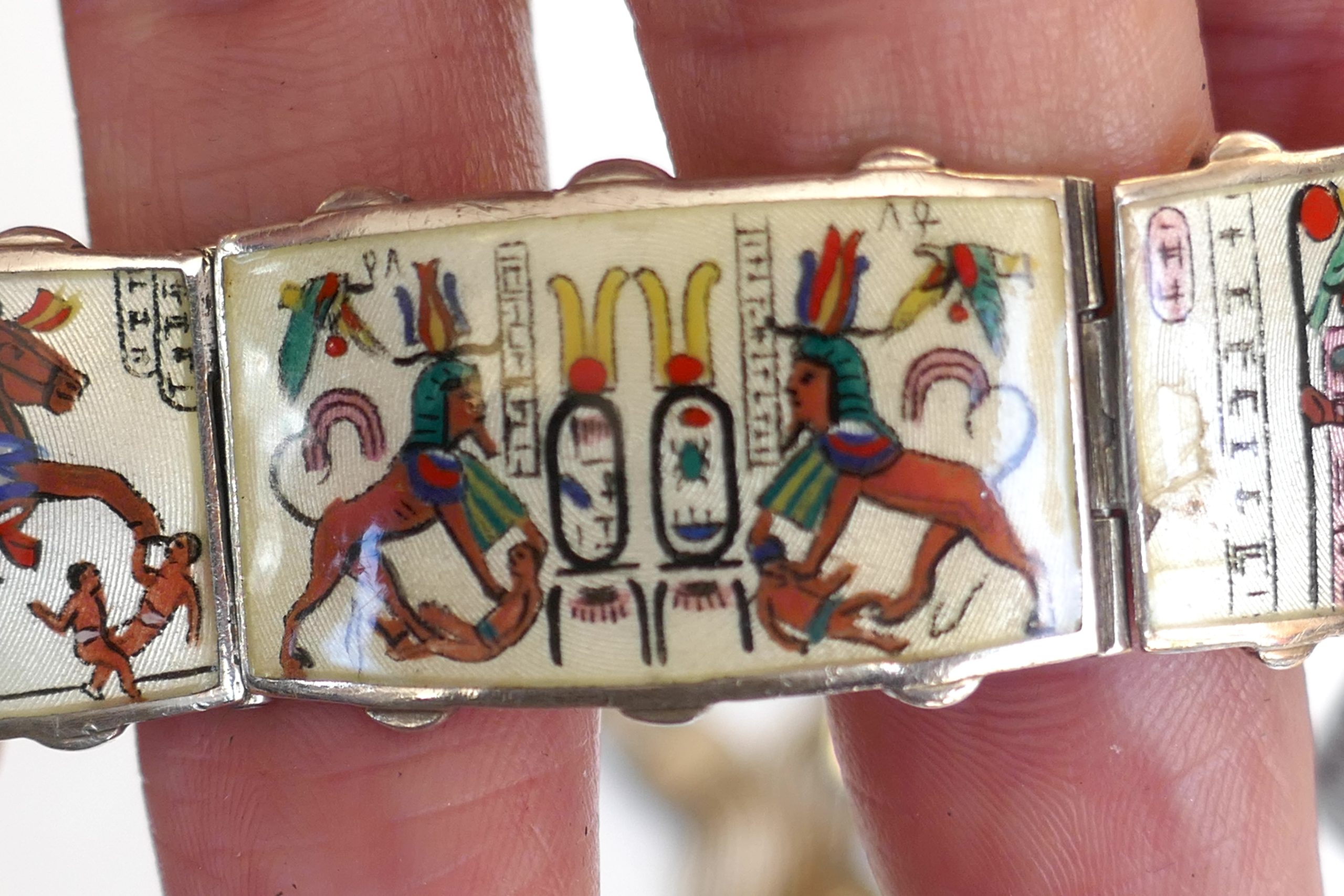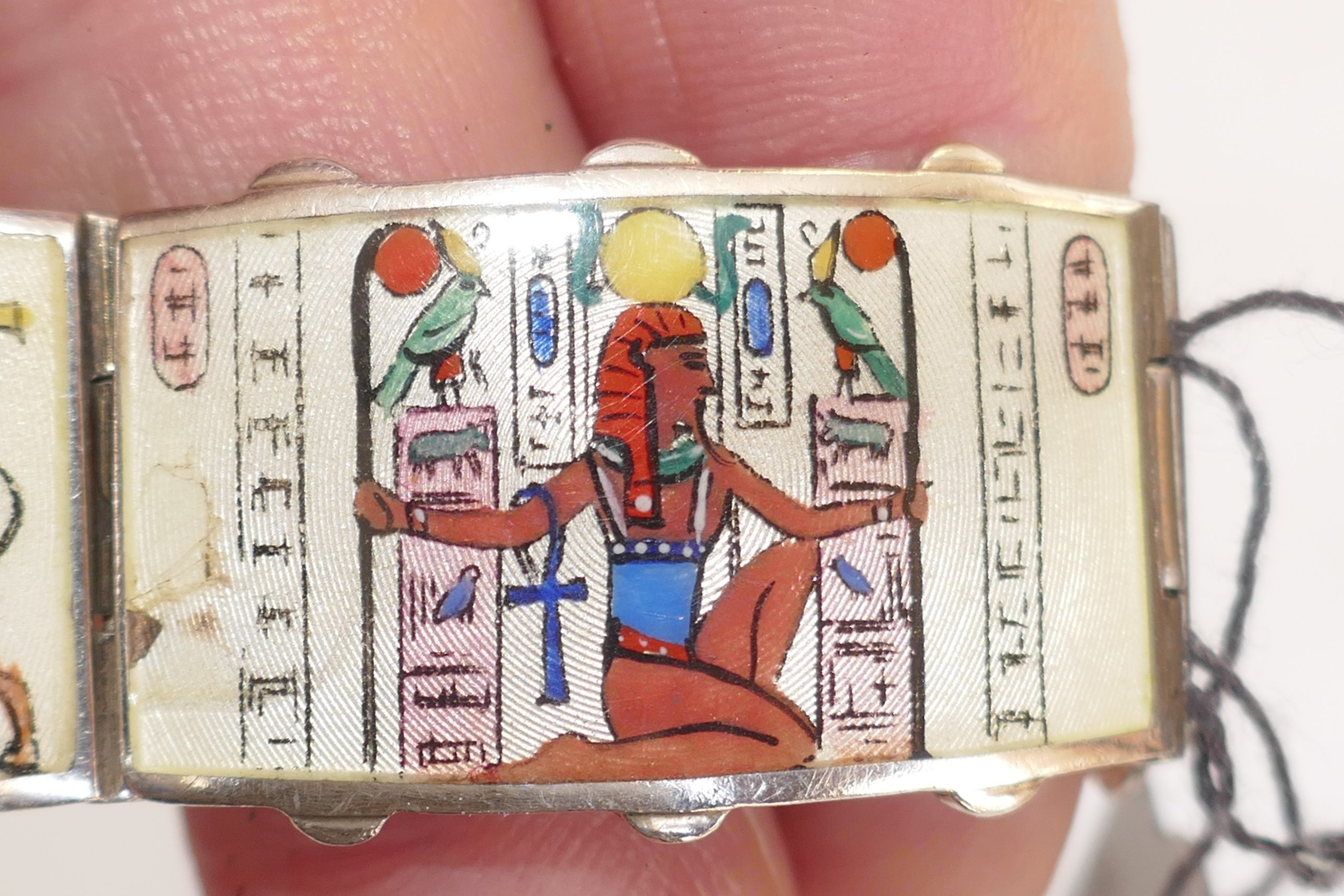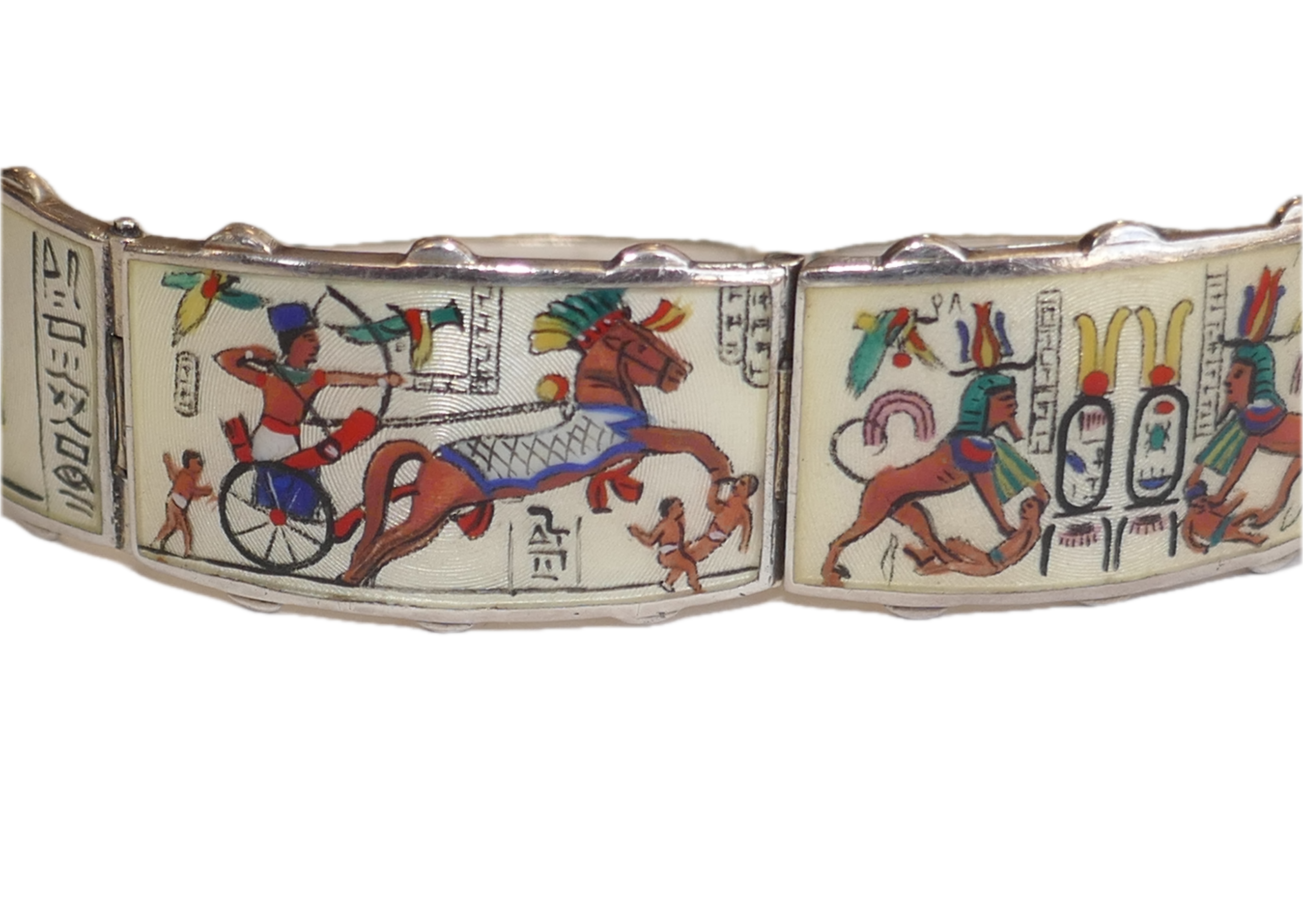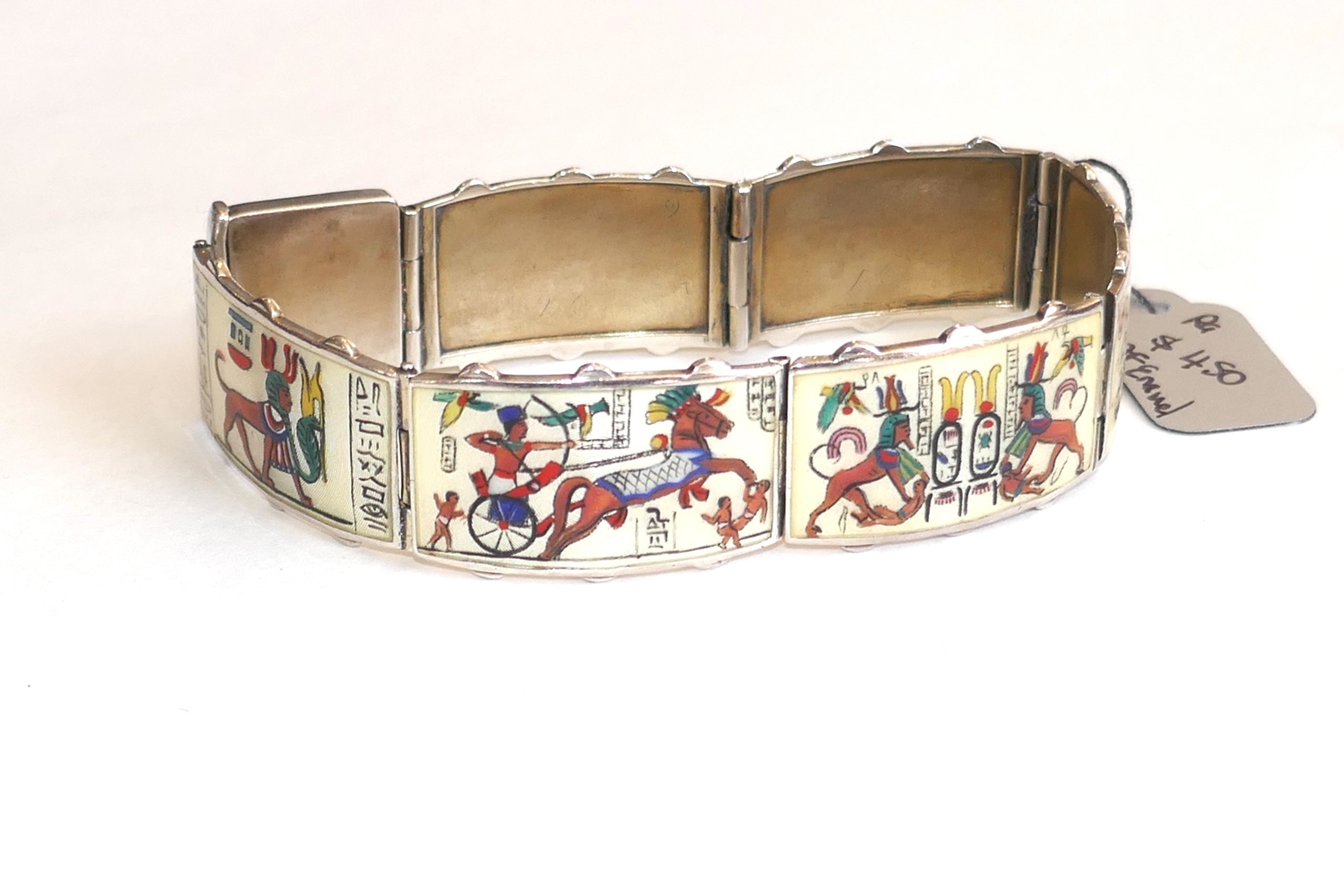 This bracelet is composed of rectangular silver panels. Each panel features hand-painted or champleve enamel scenes of ancient Egyptian tomb painting.