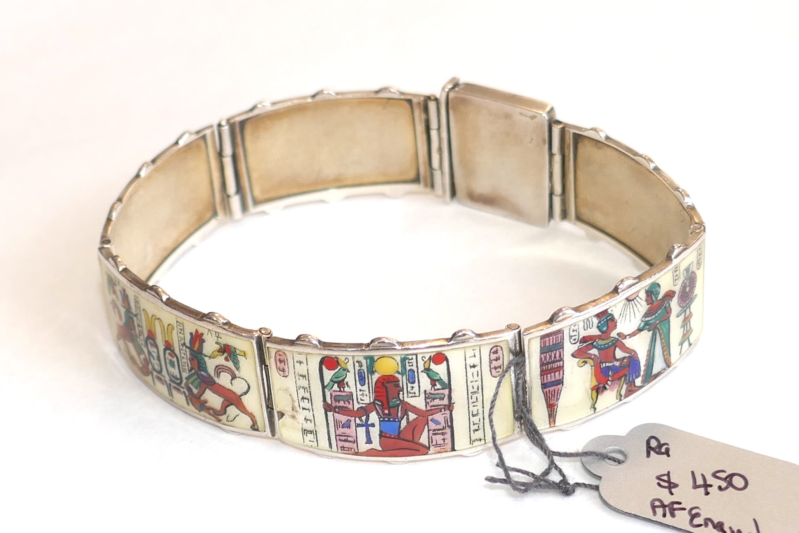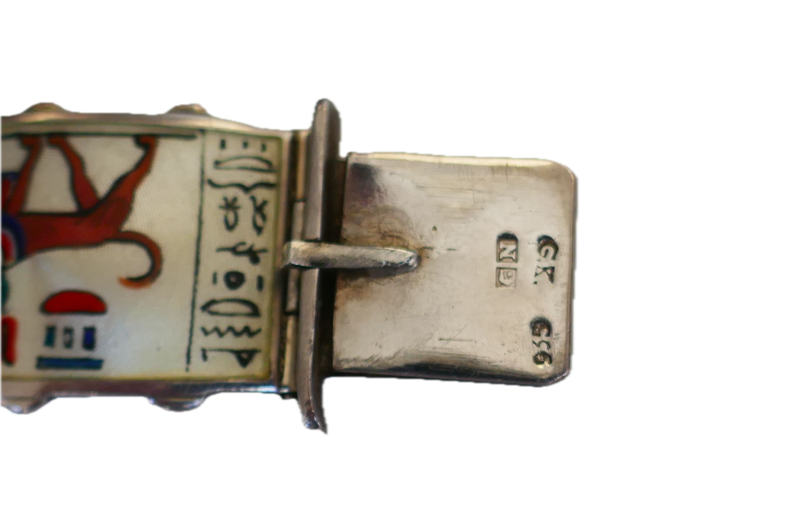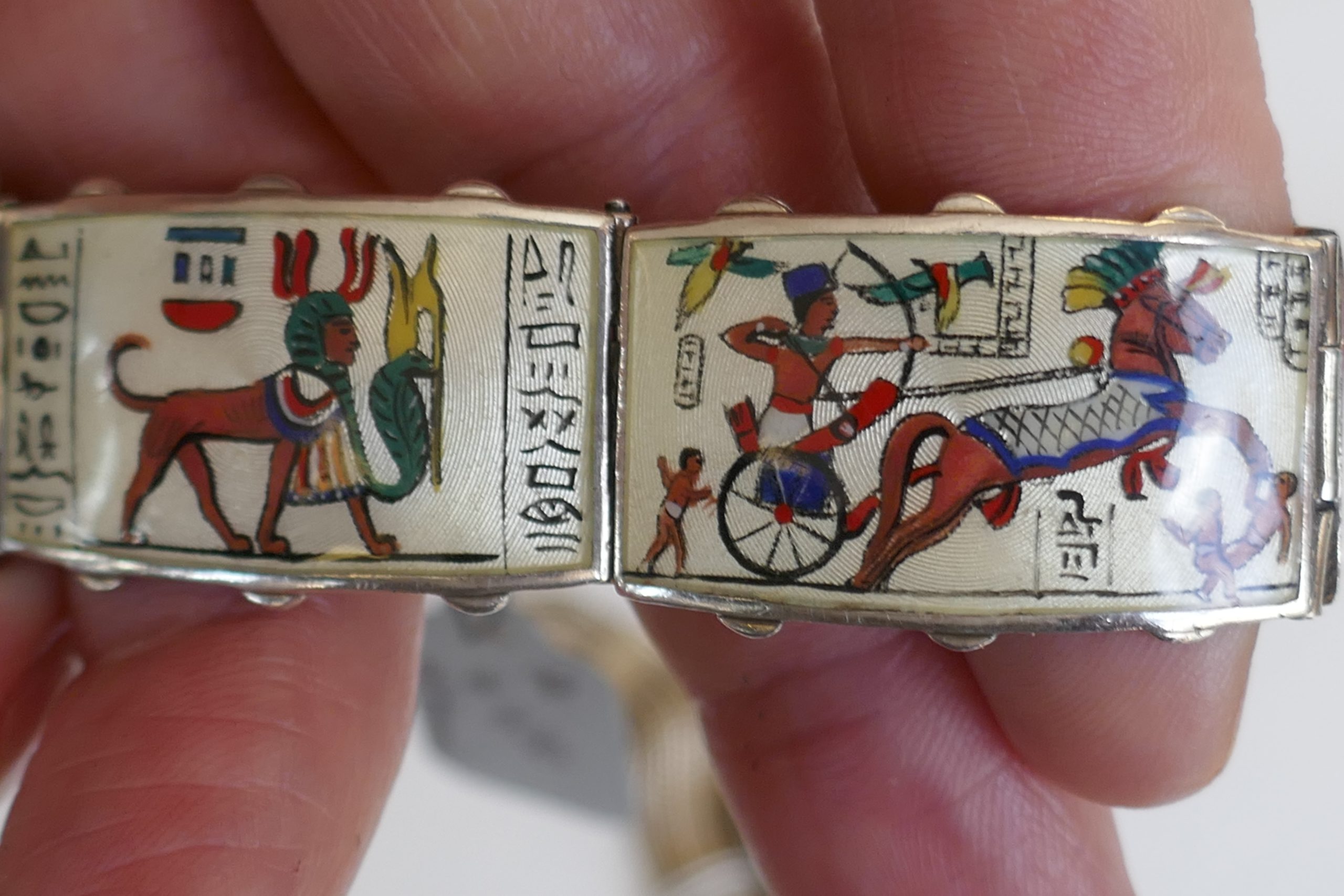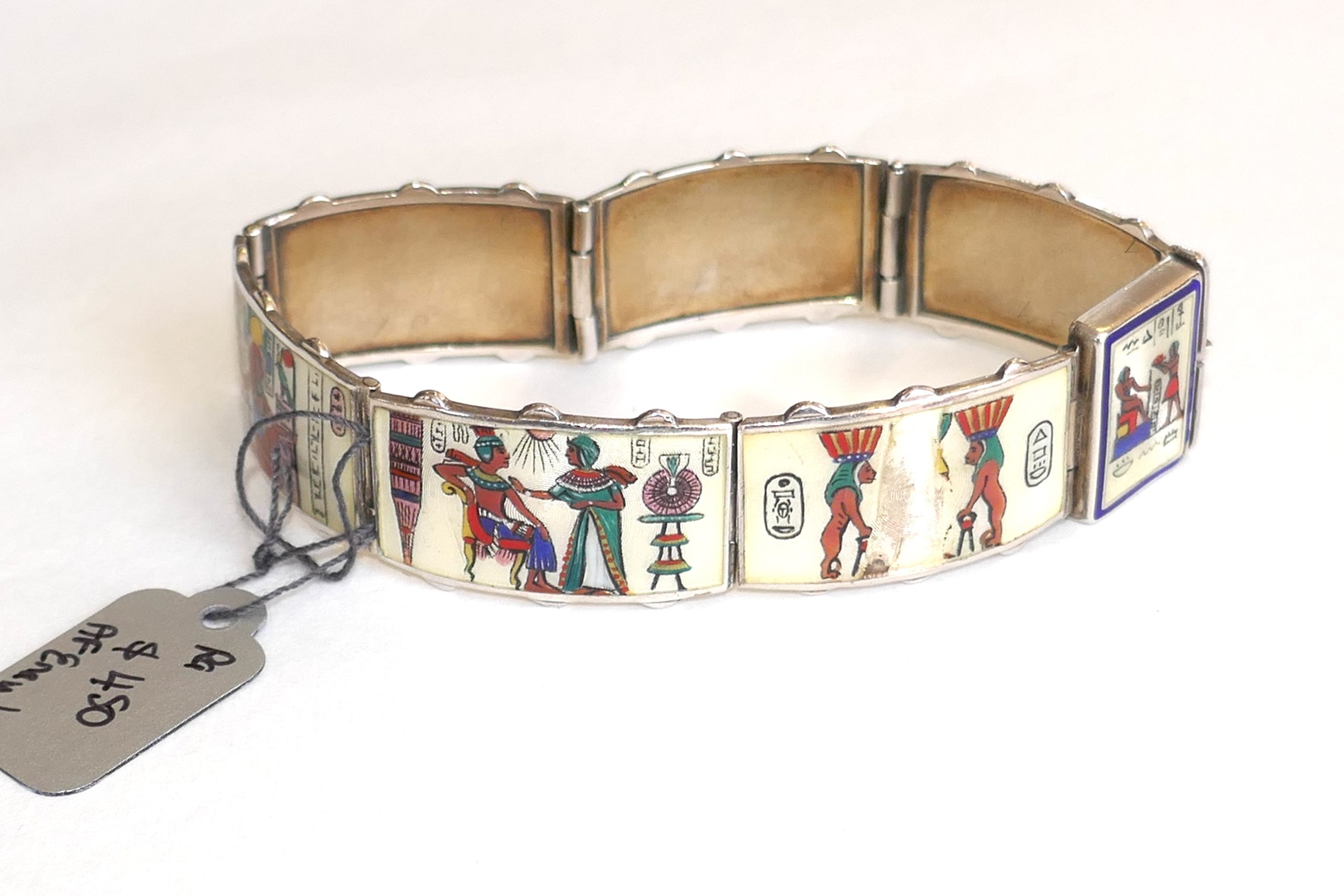 This bracelet is composed of rectangular silver panels. Each panel features hand-painted or champleve enamel scenes of ancient Egyptian tomb painting.