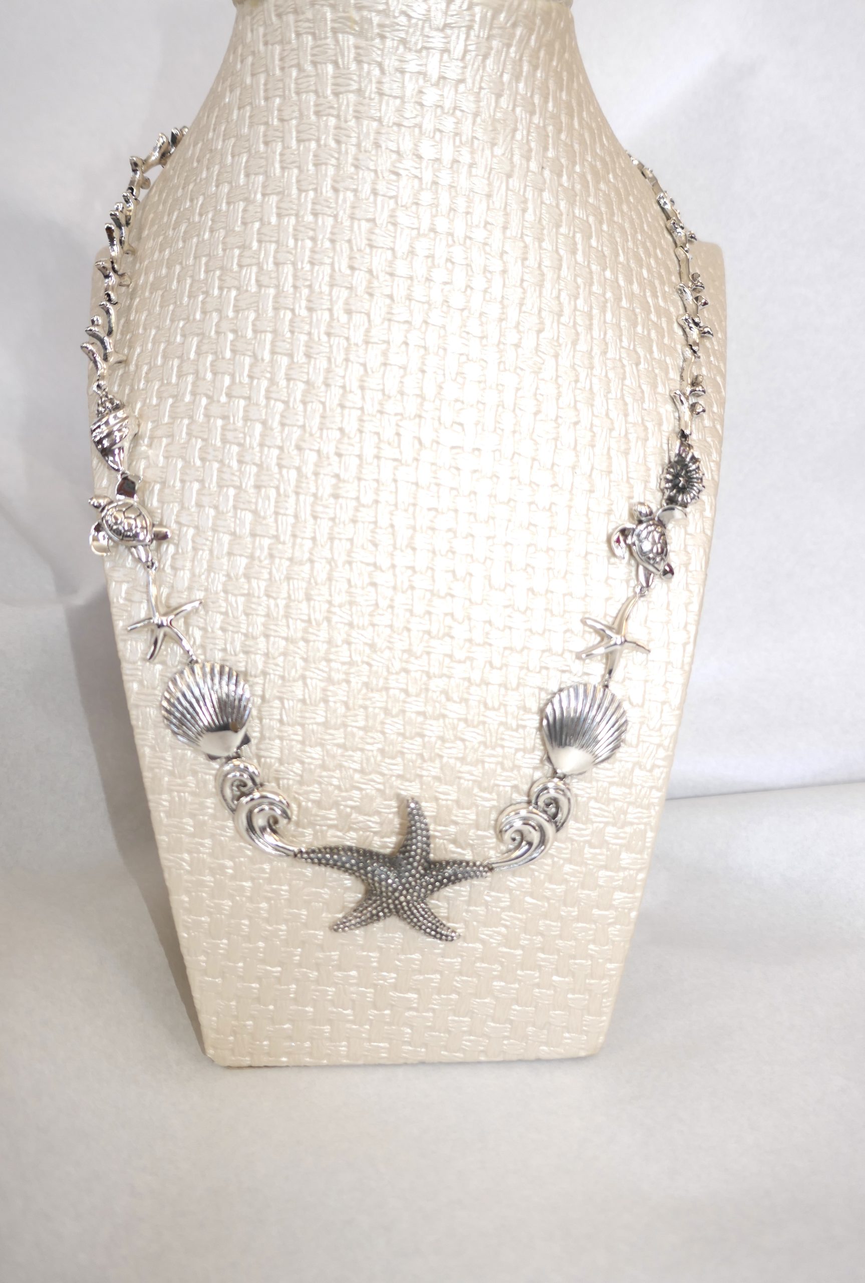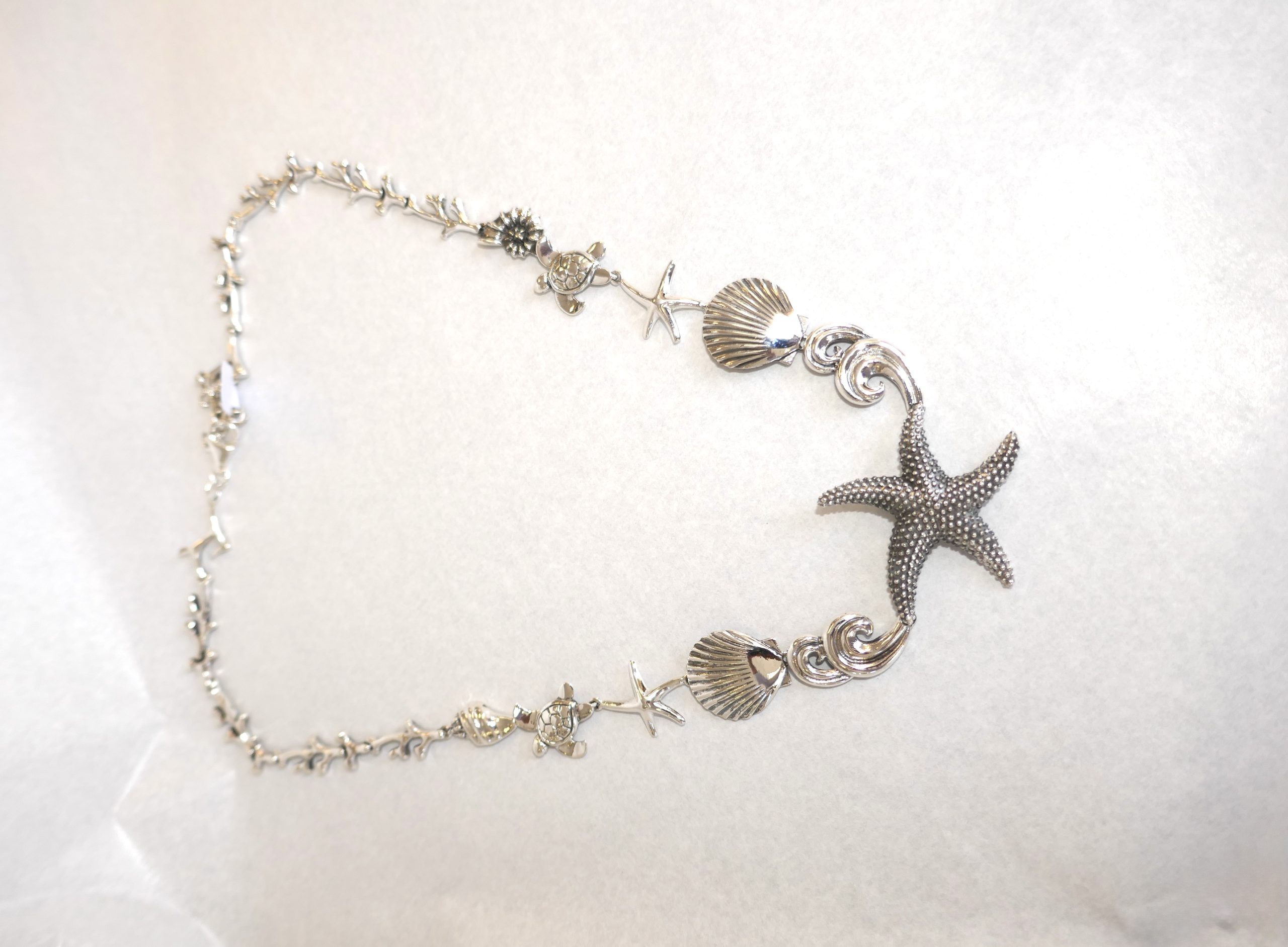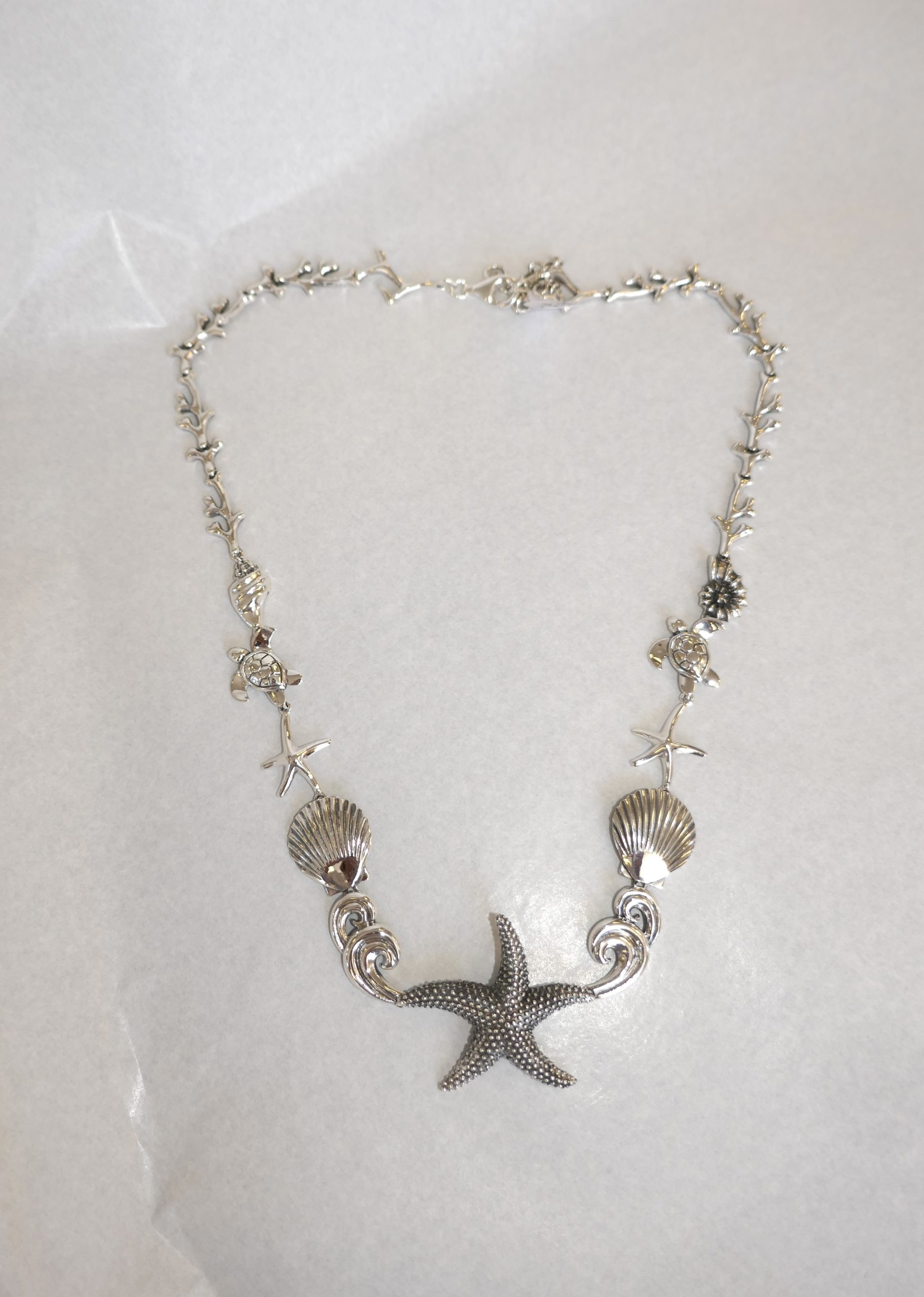 With a centre Star Fish and sea creatures set along the chain. This very unusual piece measures 39cm in length and weighs in at 46 grams.