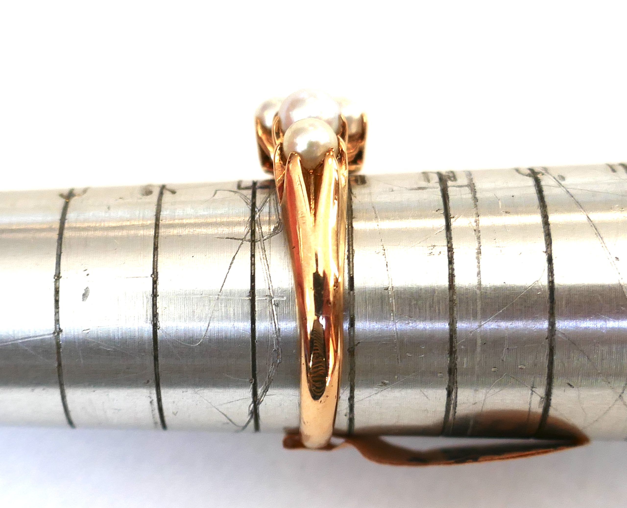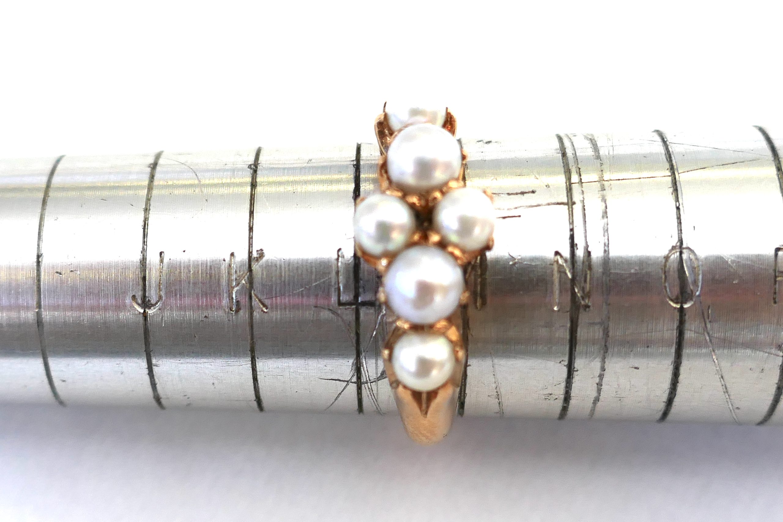 L 1/2 is the finger size of this very unusual ring. The setting is 18ct Gold with 6 claw set pearls.